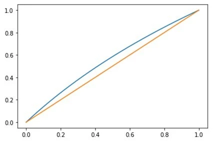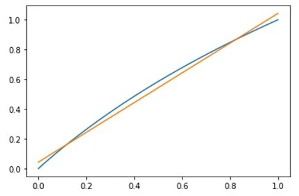 생각보다 두 그래프가 상당히 가깝게 있다는 점을 보실 수 있습니다. 하지만 가운데, 0.5 근처에서는 상당히 차이가 벌어지니 조금 보정할 필요는 있어 보입니다. 그러니 일차함수 에 보정값 를 더해서 계산해 주겠습니다. 적당한 값 를 고르면 그래프가 아래처럼 바뀝니다!